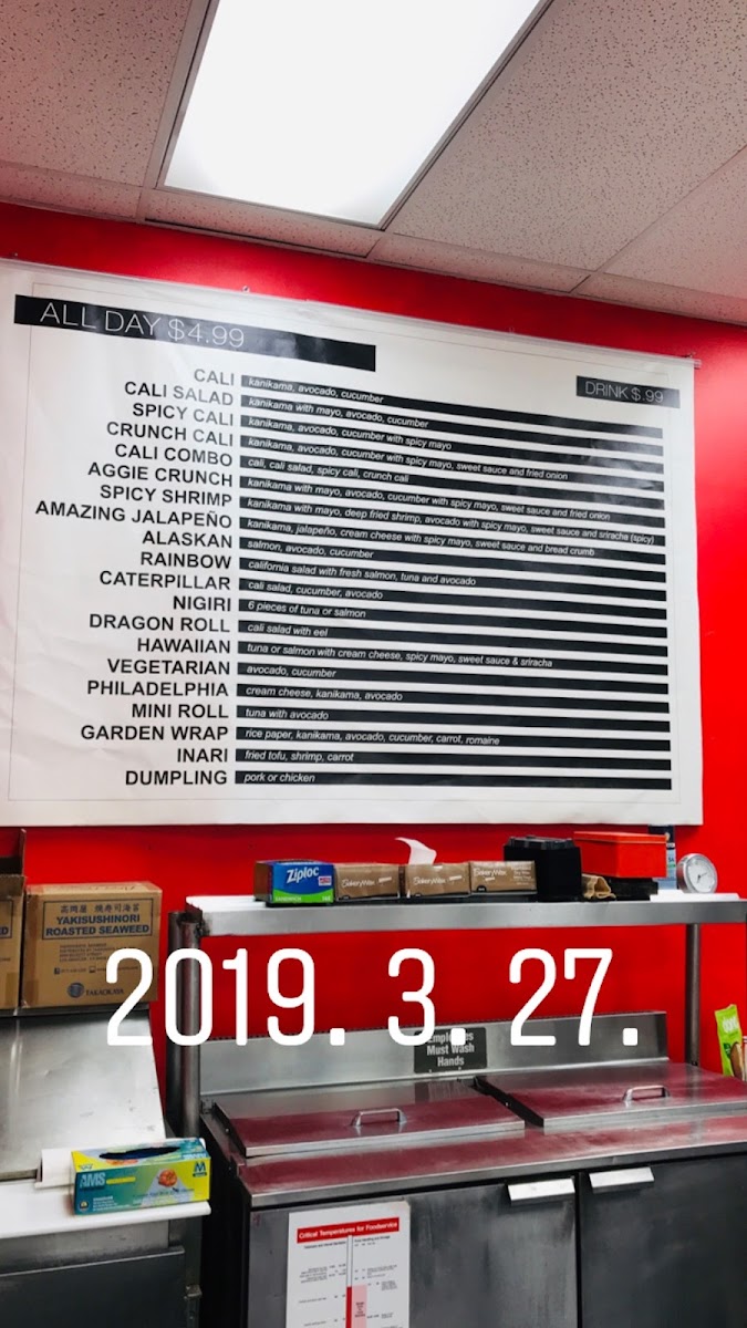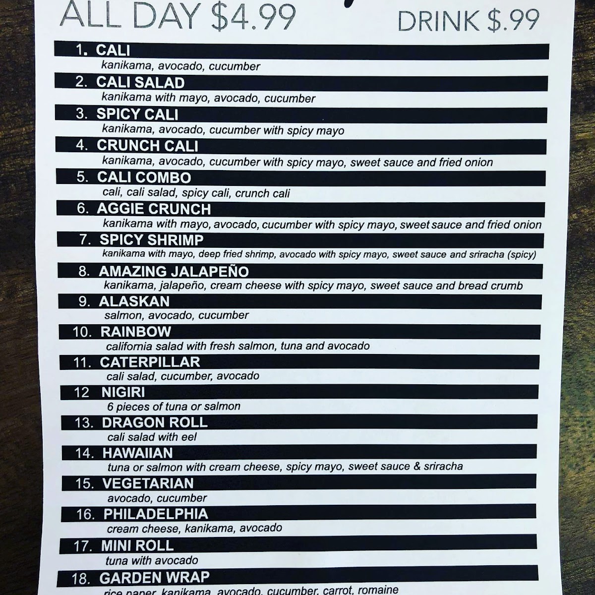 9 pieces cut each. Choose any 2 rolls. Comes with ginger and wasabi
